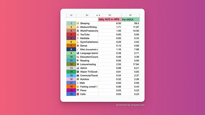 Mallesh Gujjala 启发我尝试每小时跟踪一次活动。于是我开始收集数据,目的是: