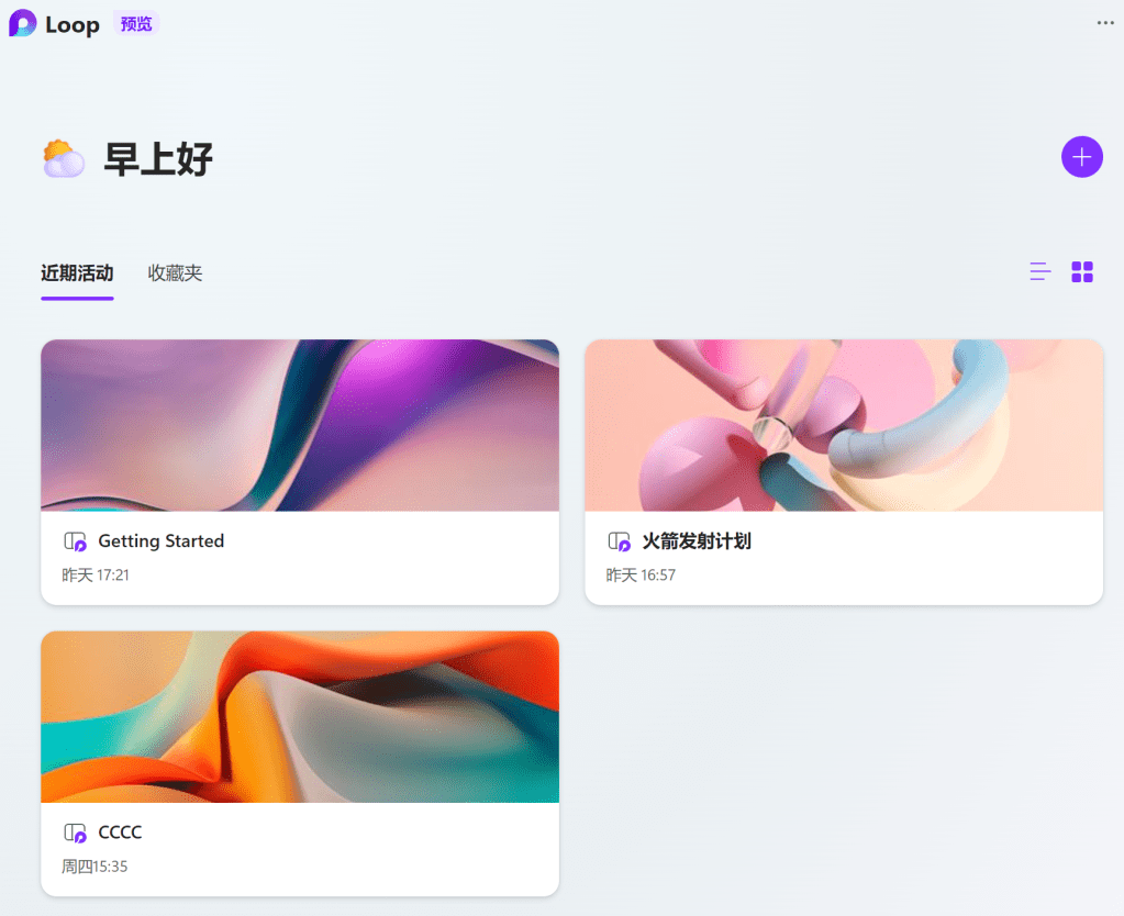 Loop 的应用首页,是一个类似 Workspace 列表的地方,可以添加自己的工作空间。 微软也内置了一个类似「上手教程」的工作空间。