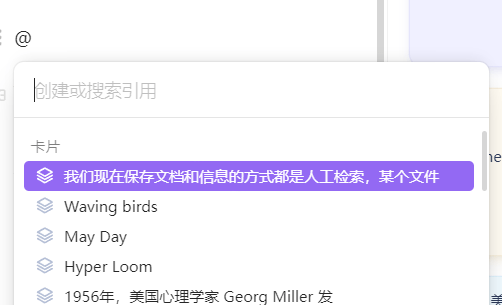 在 Lattics 里面, 采用 @ 作为 开始引用的标记(Obsidian 类的笔记工具则是 [[ 开始引用链接)。@ 后面我们可以检索一个「文档」或者一个「卡片」进行链接。