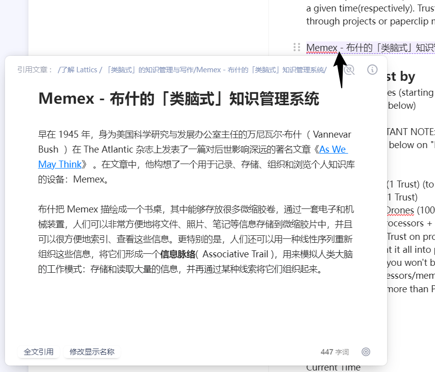 我们只要点击引用链接或脚注,就能看到 「卡片缩略形式」的引用内容。 在缩略界面里面我们还能直接编辑内容。