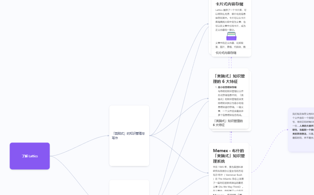 一旦涉及了「文档」和「卡片」的交叉引用,我们就会发现引用关系会变得很难看清,我们除了可以从 文档自身的「元属性」中获取正反链接的信息,还可以借助 Lattics 的「关系图」功能进行更直观的梳理。