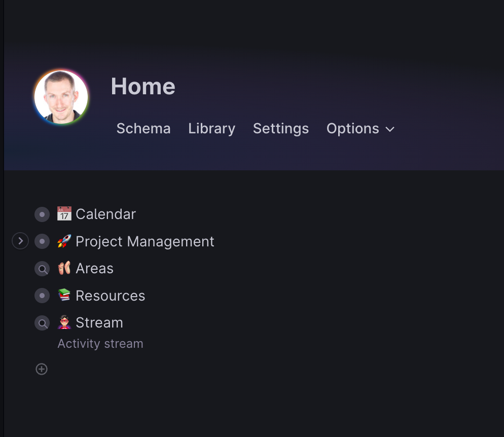 在 Tana 中,默认情况下,有这样的结构体系:工作空间 / 根目录 / 日历 + 库 + Schema。