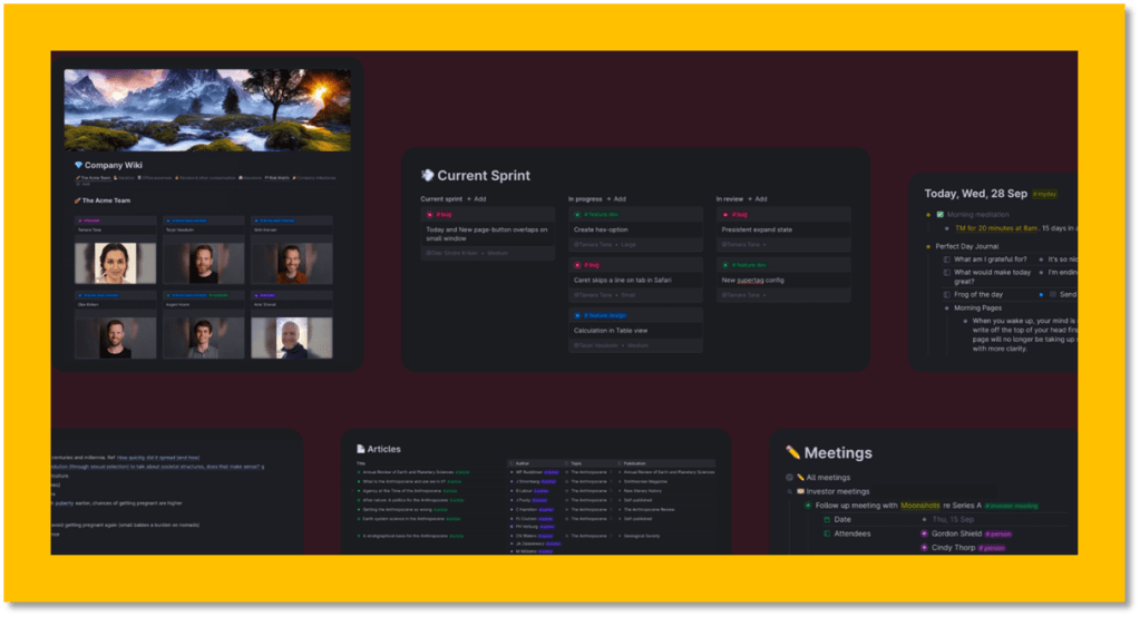 就像在 Notion 中一样,我们可以拥有共享关系的数据库,这样就可以轻松地交叉引用数据和信息。任何节点都有能力形成自己的数据库。并且可以在许多不同的视图中显示,例如看板、列表、日历、Tabs 和卡片。