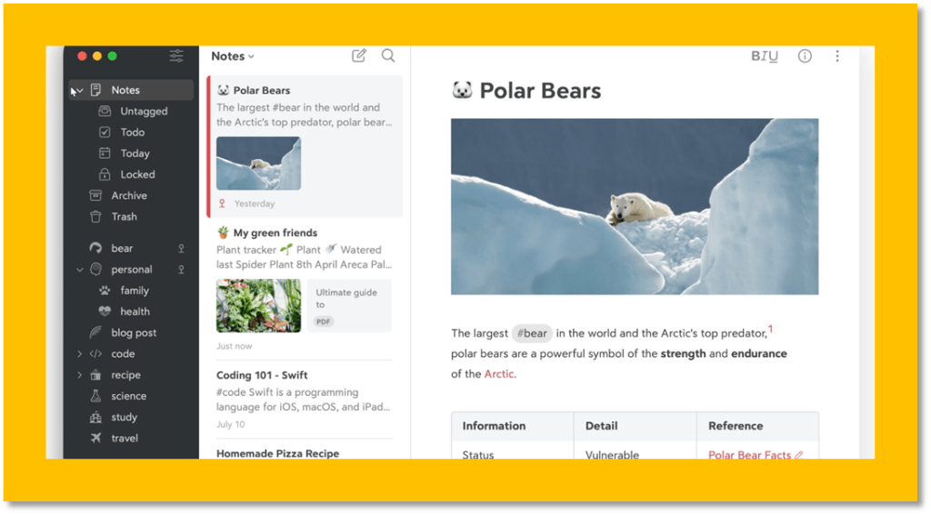 在 Bear 的编辑器里撰写 Markdown 笔记是一种流畅、无摩擦的体验。并且,随着 Bear 2.0 的新编辑器,这个特性得到了进一步的改进。现在,新编辑器「所见即所得」的渲染使得笔记中没有可见的 markdown 语法标记,这提供了更令人愉悦的写作和阅读体验。我们还是可以嵌入标签和带标题的链接,并且突出显示它们。