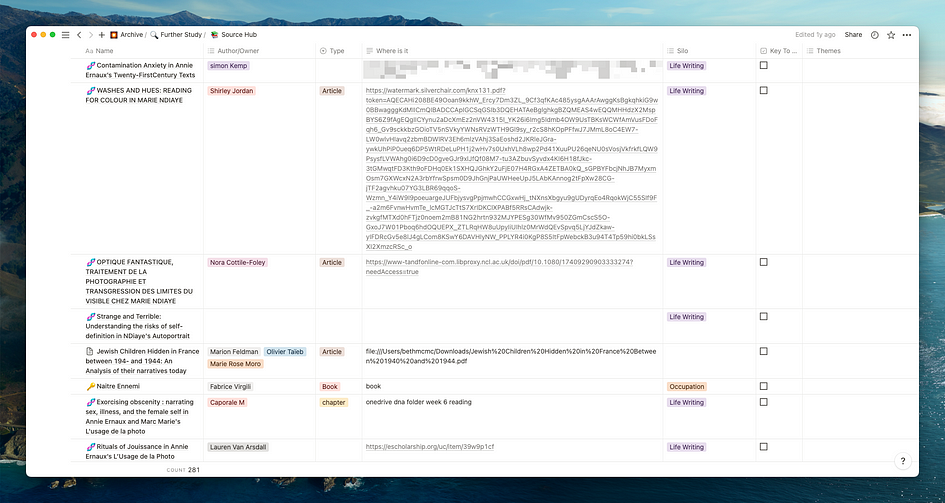 这种「阻力」在知识工作中尤其明显。我在大学最后一年,将所有的文献笔记和引文存储在我的 Notion 数据库中,一个文献来源中心。