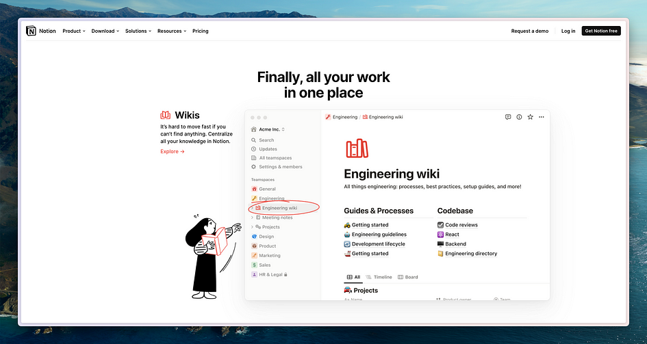 Notion 的官网首页告诉我们,它最终是我们的 「一体化」工作空间(火箭君注: 现在 Notion 还强调了 Connected Workspace, 以及 AI ),我认为将所有东西放在一起的想法和诱惑已经在互联网上传播,并使人们认为这是我们努力实现的标准,包括我自己也曾这么想。