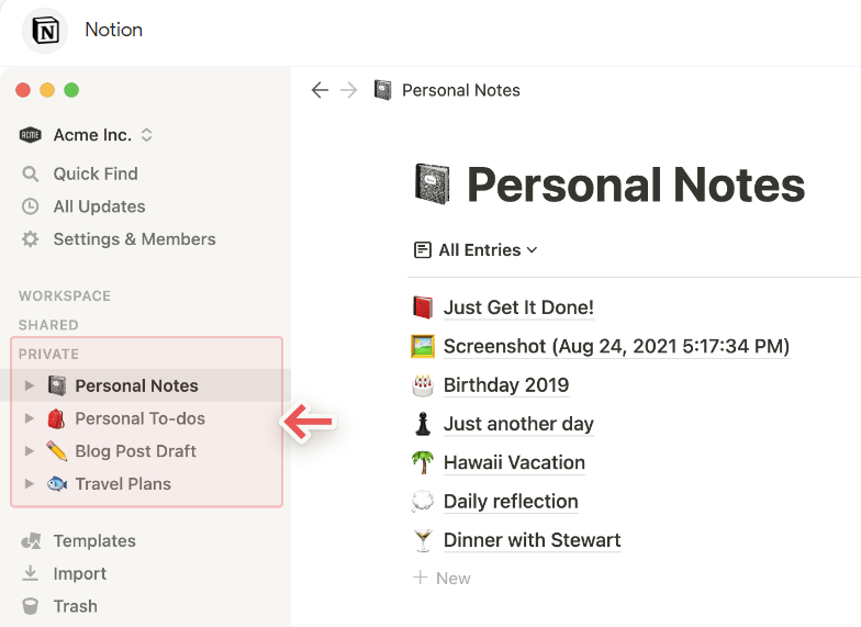 所以很多通用的软件,例如:笔记App,浏览器App, 都会默认有至少两个 Workspace。一个是:「工作」,一个是:「个人」。 这两个 Workspace, 用来隔离 我们不同项目的「上下文」。 比方说:私人浏览的页面书签集合 和 工作用的专业网站或业务系统网站 就应该完全隔离开来(包括登录账号)。 Notion 这样的笔记软件也是一样,多个工作空间可以有不同的笔记,模板,设置,甚至还有不同的订阅套餐。