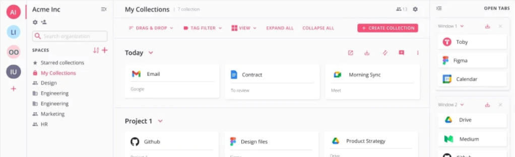 Workona 就更像是一个完全的 Workspace 管理工具了, 除了书签分组收藏, 还有额外的一些加成: