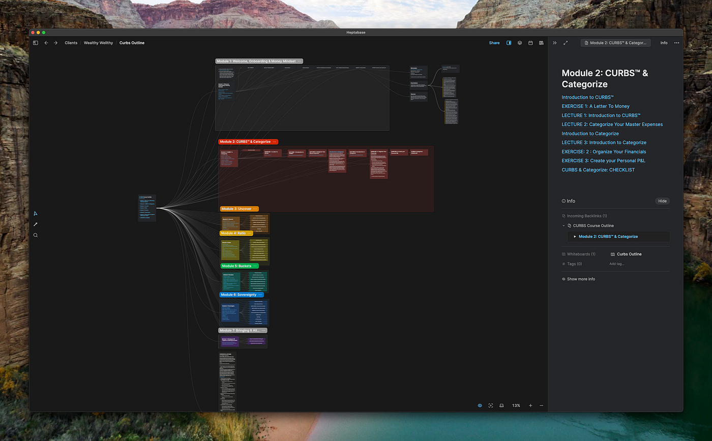我首先通过 Heptabase 不同的模块和课程概述它。我为所有东西创建了卡片,并从中创建了 MOC(内容地图),然后这帮助我创建了制作课程骨架所需的基础。