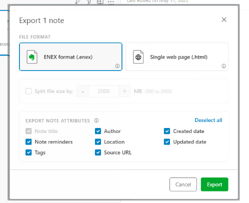 Evernote 中有三种导出选项: