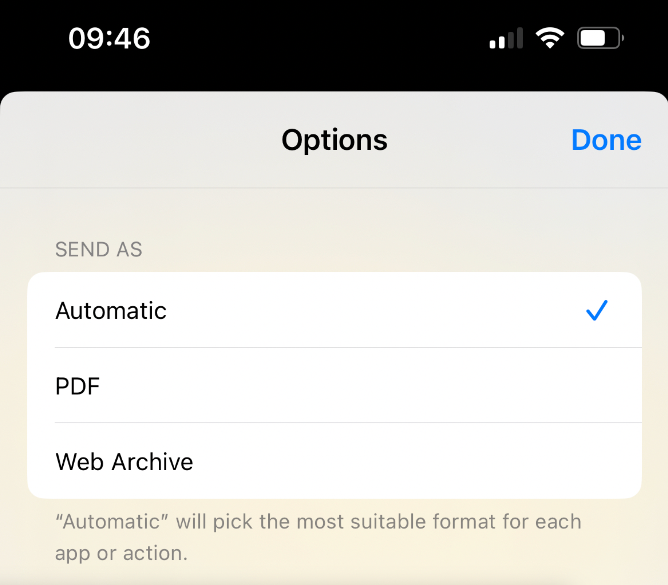 我当前简单的变通方法是:如果 MacOS 上的非 Safari 浏览器中有一个网页我想要剪辑,我会在 Safari 中打开它并在那里共享到 Notes(作为 PDF 或链接)。我们可以利用链接下方的“选项”菜单来决定是将整个页面剪辑为 PDF 还是链接:
