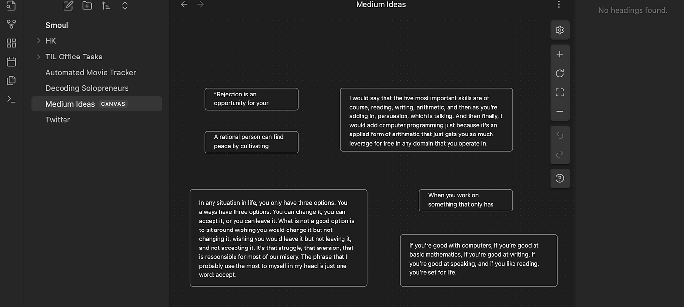 在很长一段时间里,通过 Obsidian 保存我的想法并为它们提供视觉效果是非常方便的(火箭君注:Obsidian 有了 原生的 Canvas 以后,一切变得很简单, 而且第三方白板插件也很出色,甚至可能超越原生)。
