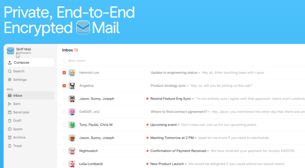 Skiff 在短短的运营期间中,获得了不少好评, 主要来自于那些注重数据所有权和隐私的用户。 这些用户不喜欢 Google 的大厂风格,尤其是拿用户数据去投放和训练。 (各位可以想想自己在Gmail 里面看到的穿插广告)。 而 Skiff 主打的 「端到端加密」以及「开源」都是让人放心的举措。