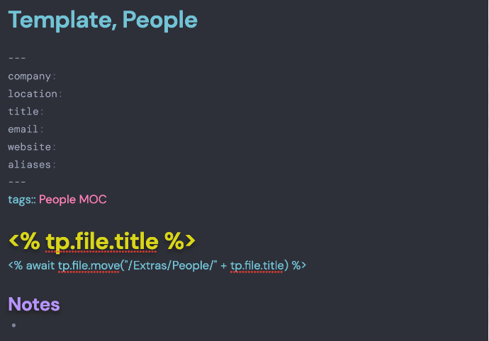 我创建的几乎每个笔记都是从模板开始的。我大量使用模板,因为它们允许我懒惰地添加信息,以帮助我稍后找到笔记。为每个类别我都设有一个模板,其属性位于顶部,用于捕获数据,例如:
