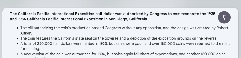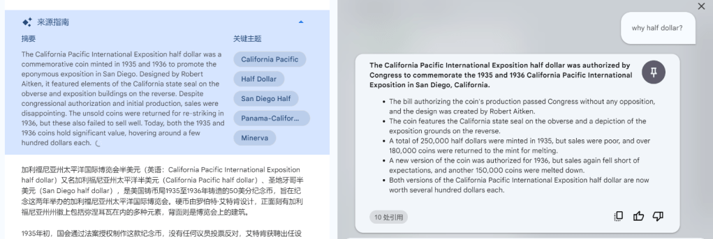 例如:我们可以上传一段「加利福尼亚州太平洋国际博览会半美元」解释资料,然后就可以问 AI「为什么是半美元?」 。 然后,AI 会根据材料给出答案,这种感觉很棒!