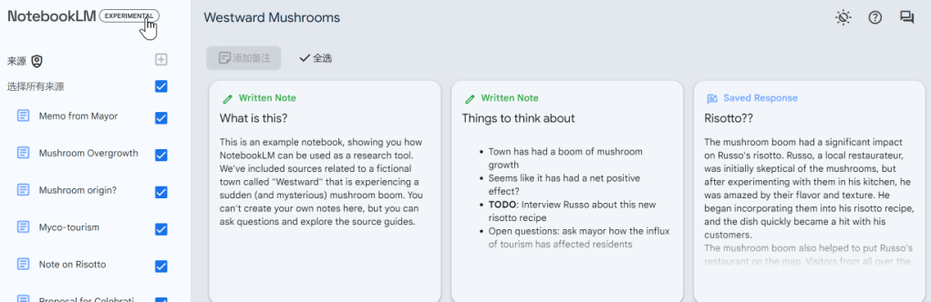 这种区分开来的组织方式有其特别的逻辑。 那就是 source 是不能随便编辑修改的, 而 Written Note(有时系统也会称之为备注)则是可以修改编辑的。 一旦回答基于 Source 给出,如果我们还能再去修改 Source 那么势必会造成某种矛盾。 这就是 NotebookLM 目前的主要组织信息的方式:看信息类型是「来源」还是「备注」。