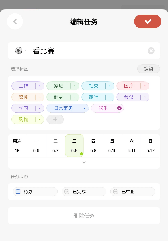 日程不支持填写具体时间,可以手动排序前后位置(很奇怪,但是的确减少了输入负担)。日程项目(或者说任务项目)有「类型」标签和「完成状态」标签可以编辑。 不过好像意义不是很大,因为没有发现特别的统计和筛选入口。