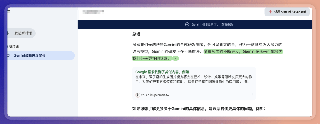这是 Google 自己出的 AI 回答引擎,最初是一个 chatGPT类的AI问答工具,现在也会根据搜索结果进行总结答案。感觉无论速度和质量都远不如 Perplexity。 甚至还会提示用户:要不直接去 Google 搜索吧。 有意思的是,Gemini 提供了依据谷歌搜索进行「核查」的功能,可以告诉我们回答里部分内容的出处是哪里。