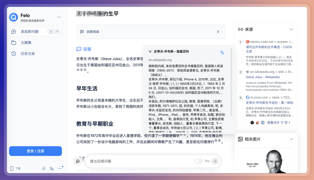 火箭君有幸今年上半年和 Felo 团队在东京会面,当时他们在做 Felo 实时语音翻译。现在,Felo 将多语言的特性带到了 AI 搜索里面,主打「用母语搜索世界」。 虽然主要功能也是AI 回答并给出搜索出处,但是 Felo 可以用大家可以理解的语言搜索外语的网站,并且用翻译过的语言给出答案和网页摘要。光这点就超级棒了。 这也和他们团队之前做AI翻译的深厚积累有关吧。