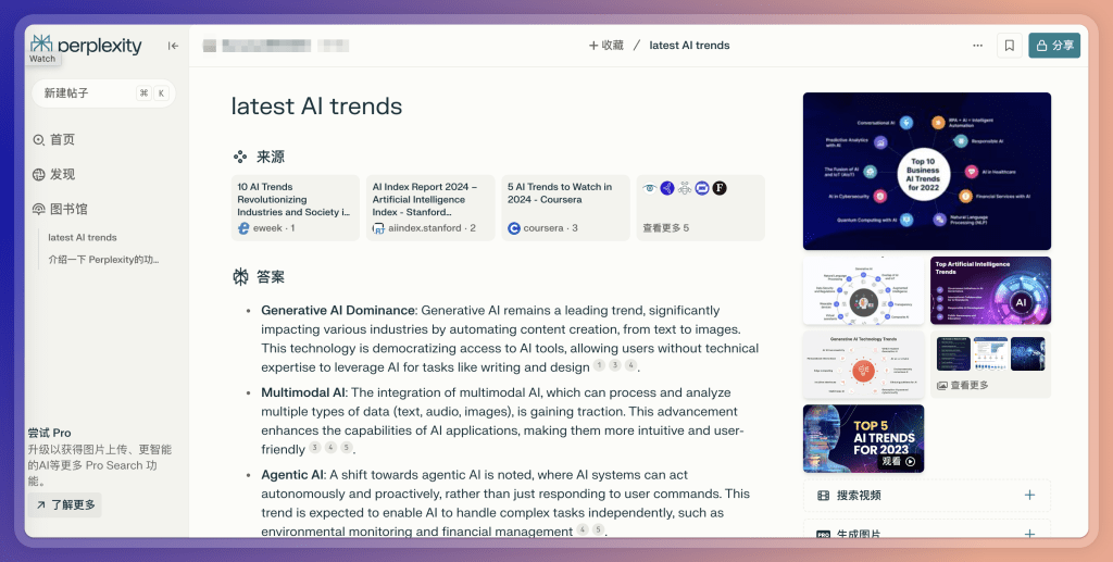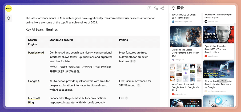 这是一款有趣的AI搜索引擎。 形式比较多样,除了答案和出处以外,还提供了 思维导图,表格等形式。 右侧还有一个「探索」栏,让我们发现更多类似网站,这点我个人比较喜欢。 话说回来,思维导图形式也已经被很多AI搜索工具用烂了,我甚至有些反感,各种工具一语不合就转换成思维导图,好像这就能突然找到付费点了(一般还都是 Pro版专享的付费功能)。
