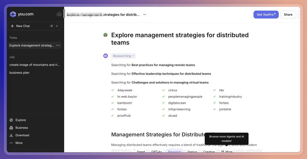 这是另一款成名较早的工具,也早早获得了融资,出道的收连 AI 还没有火起来, You.com 主打个性化隐私搜索,引入各种模块,包括一些垂直的搜索,例如针对论坛,针对维基百科 ……