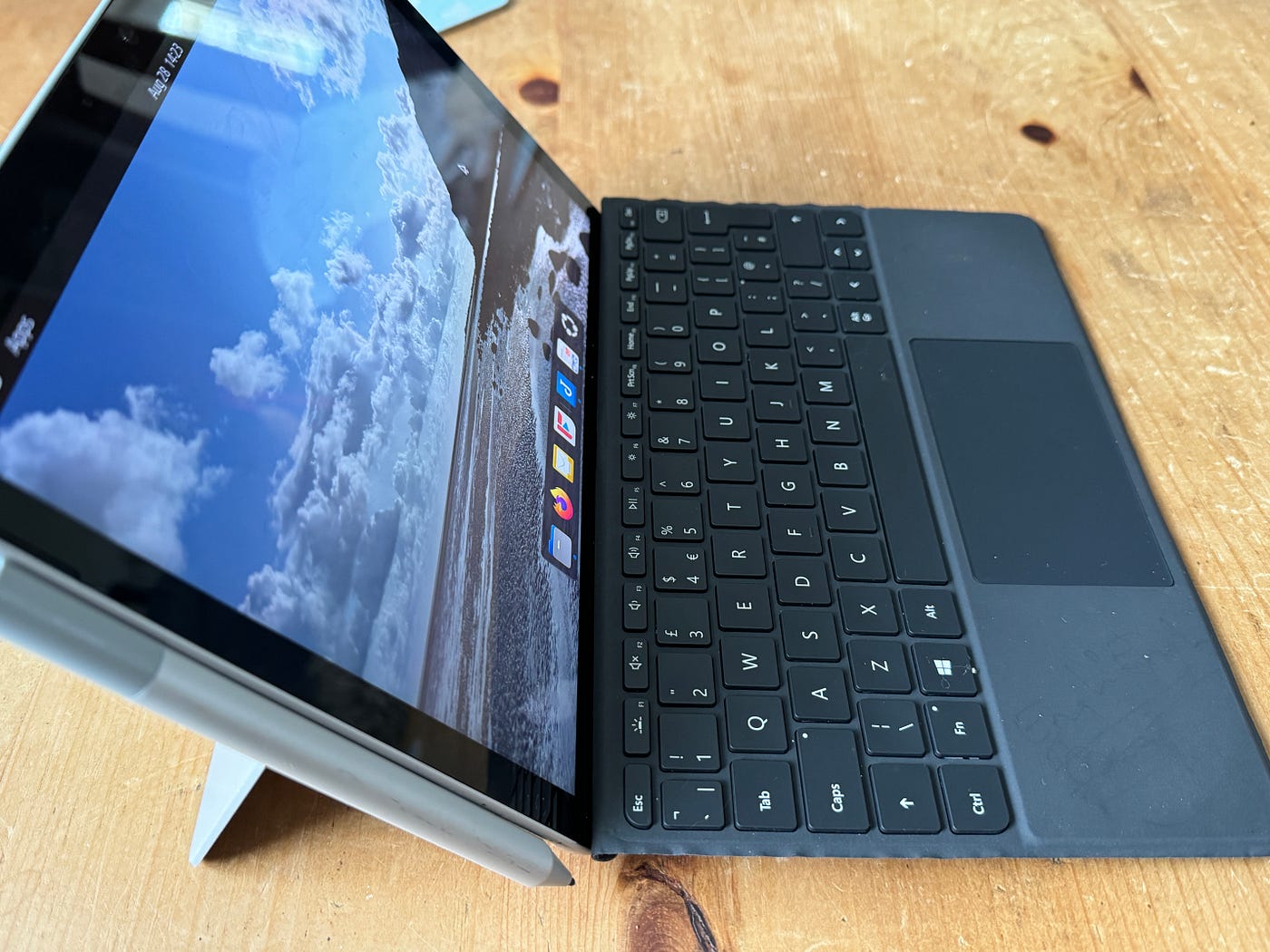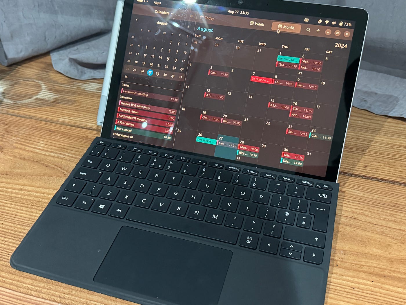 更重要的是,Surface Go 的手写笔在 Ubuntu 上也表现得非常好。我举个例子,我昨晚参加了一个社区会议。期间我完全靠这台 Linux 平板做笔记。在平板上,我使用一个叫 RNote 的笔记应用。我用手写笔进行记录,手写笔是我购买的二手货。手写笔的灵敏度非常好,输入流畅。在这次会议中,我完全将设备当作写字板来用,而到了晚上,当我需要写一封电子邮件时,我将 Surface 自带的键盘保护盖轻松滑出,就可以继续进行键盘输入操作了,整个过程丝滑无比。可以说这个设备非常适应我,而不是让我去适应一个系统。(火箭君注:其实在这方面 iPad 也很好,除了价格贵以外)