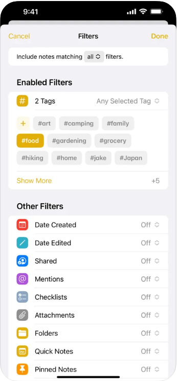又比方说,高级搜索,在很多笔记里面都是重头所在,Obsidian 和 LogSeq 甚至可以撰写查询脚本。 稍差一点的也有元信息过滤语法机制(指定某些特定文件夹搜索,也算一种元信息过滤)。这一点我们或许可以寄希望于 Apple Intelligence,不久将来应该可以向自己的备忘录进行自然语言提问和搜索。 尤其是苹果的 「相册」已经可以做到AI识别归纳标记,并用自然语言词汇进行搜索,Apple Notes 应该也不远了。