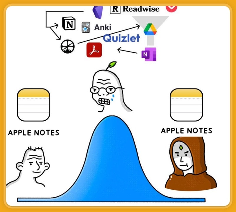 网上也有梗图(下图),小白和高手都会使用 Apple Notes,只有中间派才会折腾一堆笔记工具。 火箭君也有过译文:【译】为何以及如何从 Evernote 切换到 Apple Notes