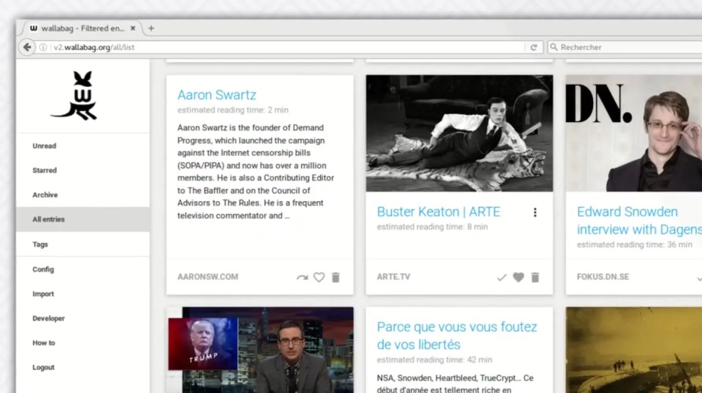 Wallabag 也是一个开源自托管的应用程序,旨在保存网页以供日后阅读。它也会提取页面内容,而且难能可贵的是,它还提供在智能手机、平板电脑或电子书阅读器上使用的 App(下图)。