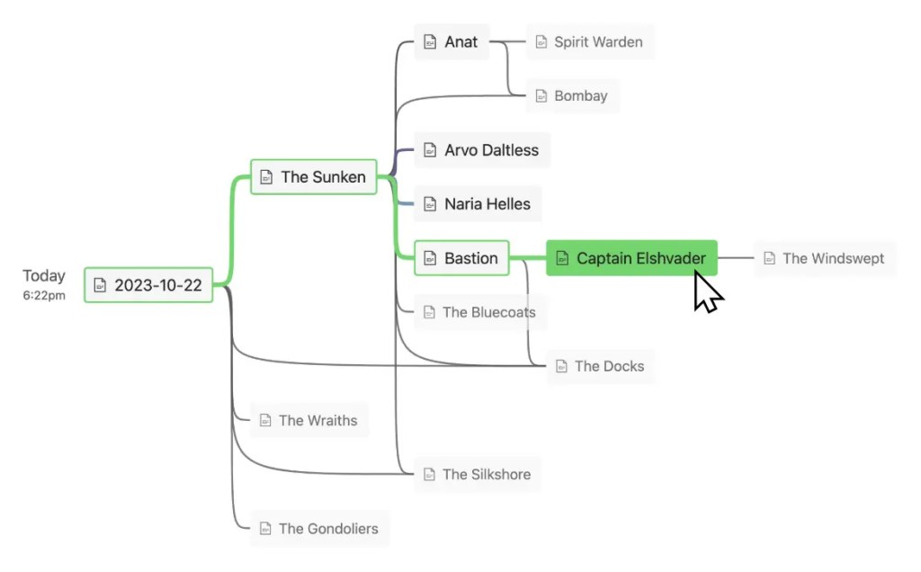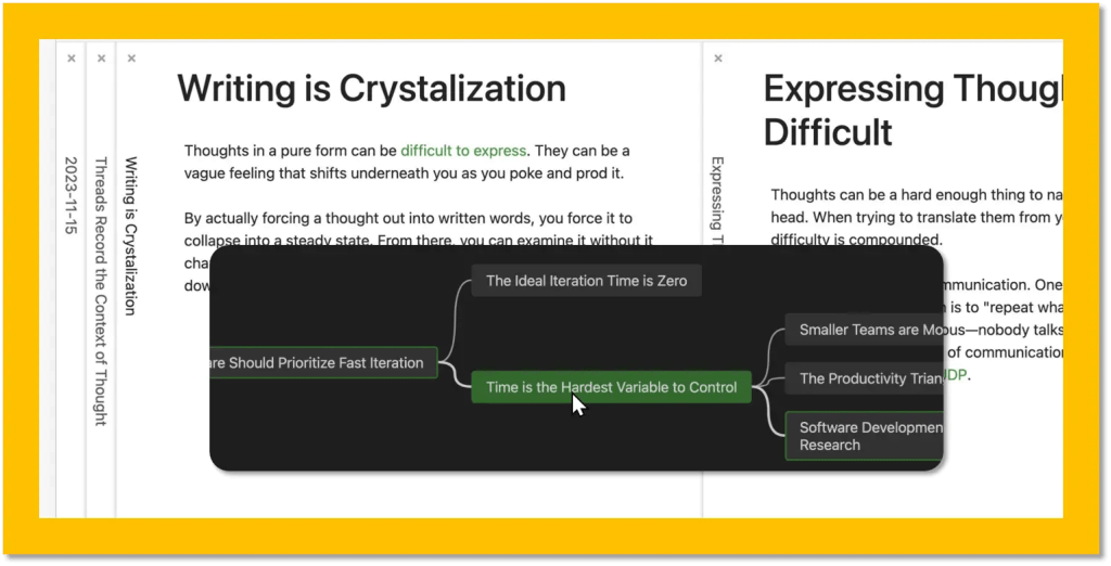 让我们回到几年前,Obsidian 刚诞生不久的时候,由于受到当时时 RoamResearch 双向链接启发,Obsidian 实现了一个「本地优先」版本的双链笔记管理工具。 「双链」可以形成笔记的关联,组织笔记。但更重要的是,我在创作笔记时,可以不再遵循以往线性表达的思维,可以随时产生出一个分支,通过双链进行线索扩充。 Obsidian(下图) 后来有专门的插件 用帮助我们快速生成这种思维线索,而不是事后整理时才来添加链接。