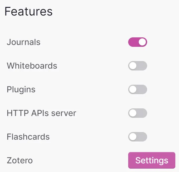反观 LogSeq 这边,没有更新也就算了,我个人觉得,LogSeq 的核心功能如此强大成熟,即使不再更新,也无所谓。但是,我害怕 LogSeq 正在「憋大招」(也就是传说中的 Database 版本)。 另外, 除了 Journals,对于 LogSeq 的白板等其它周边特性,我都是上手就关闭的,我只保留其核心的功能。换言之, 我感觉 LogSeq 一直是一个「追随者」,Obsidian 有的也要有, 但却力不从心。 这也是我害怕它「憋大招」的原因,这可能会耗费 LogSeq 团队大量的力气,但最终还是提供了一个被我上手就关闭的功能(下图)。