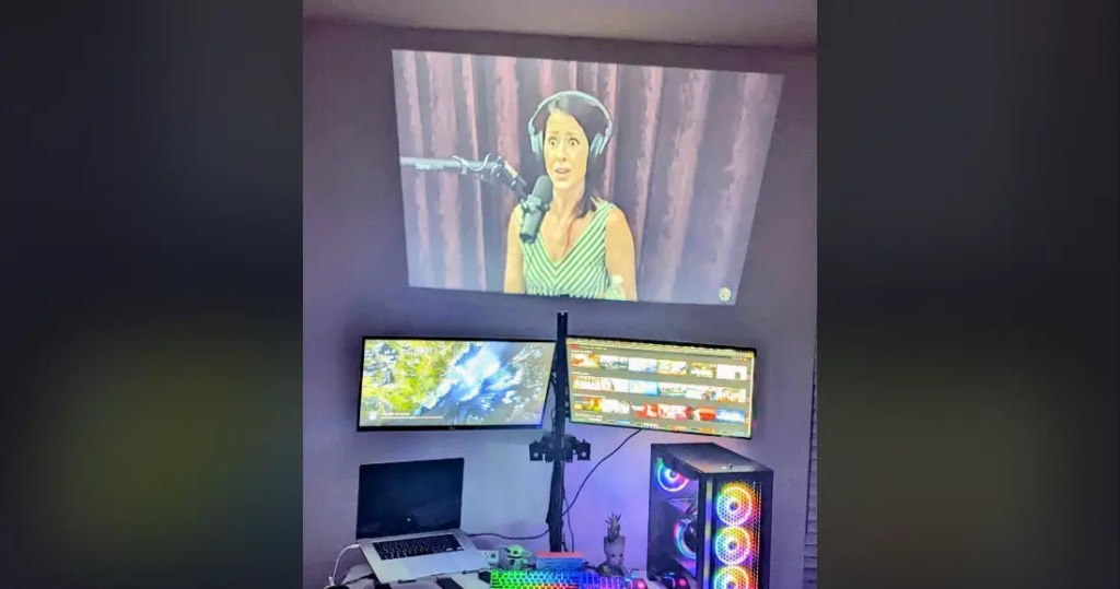 最后,看看海外一个真正的「多屏党」用户(seered27),使用投影仪和多块显示器构建的工作空间吧。 我觉得脖子可能会受不了。