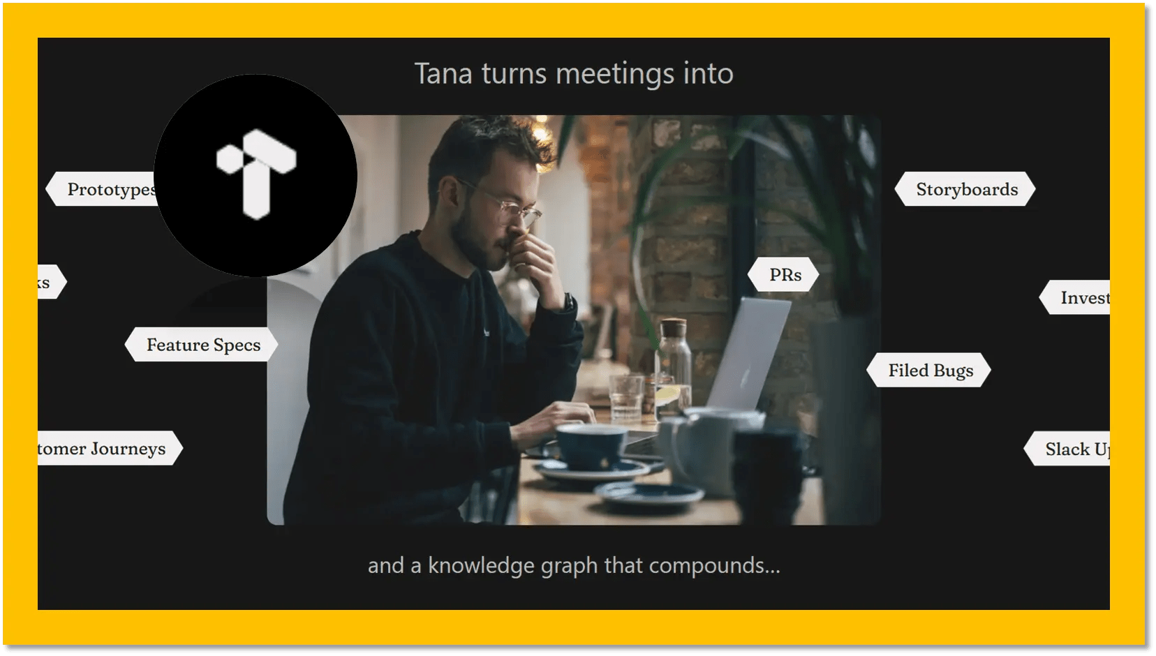 新 Tana 想要在开会的同时,把决策、bug、行动项直接塞进 知识图谱,甚至顺手生成 PR、产品说明或用户旅程图。它自带视频会议体验,未来还计划接入 Zoom 和 Teams 这类 现有会议工具。很明显,Tana 想把自己变成一个以会议为入口、AI Agent 为执行层的协作中枢。